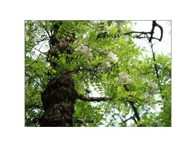 刺槐屬落葉喬木,高10-20米。樹皮灰黑褐色,縱裂;枝具托葉性針刺,小枝灰褐色,無毛或幼時具微柔毛。奇數(shù)羽狀復(fù)葉,互生,具9-19小葉;葉柄長1-3厘米,小葉柄長約2毫米,被短柔毛,小葉片卵形或卵狀長圓形,長2.5-5厘米,寬1.5-3厘米,基部廣楔形或近圓形,先端圓或微凹,具小刺尖,全緣,表面綠色,被微柔毛,背面灰綠色被短毛??偁罨ㄐ蛞干?,比葉短,花序軸黃褐色,被疏短毛;花梗長8-13毫米。被短柔毛,萼鐘狀,具不整齊的5齒裂,表面被短毛;花冠白色,芳香,旗瓣近圓形,長18毫米,基部具爪,先端微凹,翼瓣倒卵狀長圓形,基部具細(xì)長爪,頂端圓,長18毫米,龍骨瓣向內(nèi)彎,基部具長爪;雄蕊10枚,成9與1兩體;子房線狀長圓形,被短白毛,花柱幾乎彎成直角,莢果扁平,線狀長圓形,長3-11厘米,褐色,光滑。