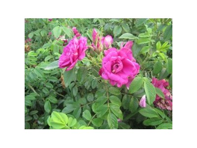 四季玫瑰 落葉灌木,株高1.6米,冠幅1.5米,花為紫紅色,香氣濃郁甜美,花徑可達(dá)10厘米以上,開花期4月下旬至10月下旬。花后結(jié)果,果實(shí)呈磚紅色。枝條光滑無刺呈亮紫色,抗病力強(qiáng)。形較開張,株叢高達(dá)2米左右牞冠幅120至140厘米,枝條較細(xì)牞除基部少量皮刺外上部分枝幾乎無刺;葉為奇數(shù)羽狀復(fù)葉,葉脈稍下陷,小葉7至9枚,多為7枚,葉片大而平展,葉色較淡,質(zhì)薄,托葉瘦長(zhǎng)。花單生或聚生,花色及香氣較平陰玫瑰淡;具有結(jié)實(shí)能力,聚合瘦果9月下旬成熟,果皮多肉,味酸甜,果內(nèi)有多枚種子。