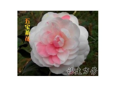 五寶茶花:(五色牡丹、彩虹五寶、草山五寶、觀音十八笑)是中國古典品種‘五魁茶’的變種,原產(chǎn)于中國福建省漳州。半重瓣唐子雙層形,濃紅色,小輪(6—7厘米),花瓣約40枚,約20枚外瓣,大形瓣花蕊突出,覆蓋冠狀唐子花心,花蕊黃色,花期1~3月,中形橢圓葉,葉柄短而多毛,樹性直立,橫張,生性強(qiáng)。突變種:大紅五寶、水紅五寶、花五寶。