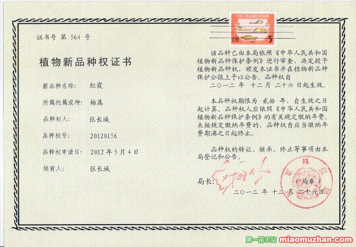 2010年,董事長張長城先生在四川省廣漢市苗場內(nèi)一棵中華全紅楊上發(fā)現(xiàn)了一顆玫瑰紅色的芽苞,通`過生物高新技術(shù)不斷的技術(shù)培育,研發(fā)成功一種全新的彩色樹種。該樹種從發(fā)芽到11月其葉、葉柄、葉脈及枝干均為鮮亮的玫瑰紅色,且性狀穩(wěn)定,因其顏色酷似朝霞,故因此得名——“紅霞楊”。2012年12月該樹種獲得國家林業(yè)局頒發(fā)的《植物新品種權(quán)證書》(證書號 第564號)。鑒定表明:該品種具備“獨特的顏色及顯色機制,具備顯著的抗病蟲害能力,其特異性能數(shù)代保持不變且穩(wěn)定”。