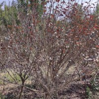 葉長卵形或卵狀長橢圓形,長4-8厘米,先端漸尖,葉基部廣楔形,葉緣有不整齊的細(xì)鈍齒,葉面紅色或紫色,背面色彩更紅,新葉頂端鮮紫紅色,當(dāng)年生枝條木質(zhì)部紅色?;▎紊?,中等偏小,淡粉紅色,花瓣5片,微香,雄蕊多數(shù),單雌蕊,花期4-5月。