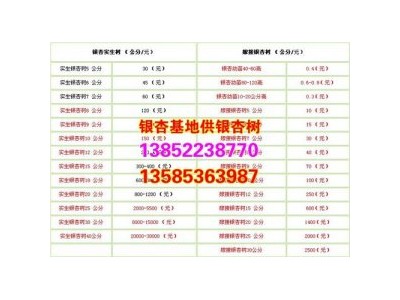 0.我們地處幾十萬(wàn)畝銀杏樹(shù)苗木基地,有資源優(yōu)勢(shì),所以,銀杏樹(shù)價(jià)格低、規(guī)格全、上貨快!歡迎您先來(lái)苗圃實(shí)地考察后再定貨。 銀杏苗圃,指樹(shù)挖樹(shù)、隨挖隨走、確保新鮮,我們真誠(chéng)對(duì)待每一個(gè)新老客戶(hù)!我們有信心讓新客戶(hù)變成老客戶(hù)。對(duì)待老客戶(hù)做到優(yōu)先供苗、優(yōu)惠價(jià)格、先用苗后結(jié)算..,老客戶(hù)可以送貨到地。 21. 我家現(xiàn)有12年生成品銀杏樹(shù)206棵,直徑約15公分且枝葉繁茂?,F(xiàn)因身體患病的原因?qū)ν獬鍪?,歡迎市政園林或景區(qū)及苗圃客商朋友前來(lái)考察選購(gòu)。 邳州市興隆苗木種植專(zhuān)業(yè)合作社地處全國(guó)聞名的“銀杏之鄉(xiāng)”,東依京滬高速公路,西傍全國(guó)重要的交通樞紐徐州,310國(guó)道、250省道穿越而過(guò),交通十分便利。 39 銀杏實(shí)生苗 當(dāng)年苗 0.15-0.25元 銀杏實(shí)生苗 2年苗 0.5-1.5元 銀杏實(shí)生苗 3年苗 2-6元 銀杏實(shí)生苗 2CM 10元 銀杏實(shí)生苗 3CM 18元 銀杏實(shí)生苗 4CM 40元 銀杏實(shí)生苗 5CM 50元 價(jià)格隨行情變化而變動(dòng),了解具體價(jià)格請(qǐng)來(lái)電咨詢(xún) 4 銀杏實(shí)生苗 6CM 65元 銀杏實(shí)生苗 7CM 90元 銀杏實(shí)生苗 8CM 120元 銀杏實(shí)生苗 9CM 160元 銀杏實(shí)生苗 10CM 220元 銀杏實(shí)生苗 11CM 260元 銀杏實(shí)生苗 12CM 300元 供應(yīng)2-80公分銀杏樹(shù),擁有專(zhuān)業(yè)起重、運(yùn)輸設(shè)備多臺(tái),專(zhuān)業(yè)移植銀杏大樹(shù)人員30多人。堅(jiān)持從源頭抓起,從選苗、挖苗、包裝、吊裝運(yùn)輸?shù)雀鱾€(gè)環(huán)節(jié)嚴(yán)把質(zhì)量關(guān),做到不合格的苗木不出圃,確保運(yùn)出去的每一棵樹(shù)都是一道風(fēng)景。曾先后為首都機(jī)場(chǎng)、鳥(niǎo)巢廣場(chǎng)、北京植物園、四川省網(wǎng)球中心、重慶大學(xué)城、四川、河北秦皇島植物園、秦皇島奧體中心、秦皇島金夢(mèng)海灣大道、北戴河中直療養(yǎng)院等國(guó)家、省、市重點(diǎn)工程提供和栽植各種高標(biāo)準(zhǔn)銀杏苗木逾百萬(wàn)株,成活率均保持在98%以上,受到廣大用苗單位及相關(guān)領(lǐng)導(dǎo)的本中心秉承“誠(chéng)信、共贏、穩(wěn)健、發(fā)展”的經(jīng)營(yíng)理念,求真務(wù)實(shí)、開(kāi)拓進(jìn)取,熱忱歡迎廣大新老客戶(hù)前來(lái)洽談合作,先考察后訂貨!