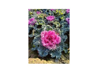 羽衣甘藍(lán)是十字花科蕓苔屬植物,為二年生觀葉草本花卉,為甘藍(lán)的園藝變種?;~片緊密互生呈蓮座狀,葉片有光葉、皺葉、裂葉、波浪葉之分,葉脈和葉柄呈淺紫色,內(nèi)部葉葉色極為豐富,有黃、白、粉紅、紅、玫瑰紅、紫紅、青灰、雜色等。葉片的觀賞期為12月至翌年3、4月份。株高一般為20-40厘米,總狀花序,花淺黃色。果實(shí)為角果,6月份種子成熟,種子黑褐色扁球形。喜冷涼氣候,適宜生長發(fā)育的適溫為20-25℃,極耐寒,能忍受多次短暫的霜凍而不枯萎,抗高溫能力達(dá)35℃以上,轉(zhuǎn)色需有15℃左右的低溫刺激;喜充足陽光,對土壤的適應(yīng)性很強(qiáng)。