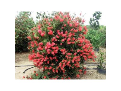 美花紅千層屬常綠灌木或小喬木,高2-3m,葉互生,條形有透明腺點,富含芳香氣味,壽命長,每片葉可維持3-6年不等,新老葉片聚生,形成葉幕層次。一年多次開花,盛花期在每年的2月份前后,長達2個月,花期長,花艷麗而形奇特,花序著生在樹梢,只看雄蕊而不見花朵。雄蕊數(shù)量多,花絲長,顏色鮮艷,排列稠密,整個花須猶如一把瓶刷子。