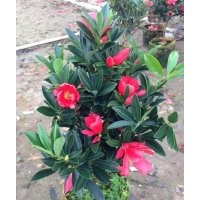 形態(tài)特征 常綠灌木,高1~2.5m,目前**高可達(dá)5m,冠幅0.5~1m,**大胸徑約5.8cm。陰生或半陰生,1年可以抽梢3~4次,株型緊湊,分枝密,嫩枝無毛,略顯紅色,老枝光滑,灰褐色。葉倒卵形、長倒卵形及倒心狀披針形,先端園鈍或者稍微有凹陷,基部楔形;葉上表面光亮碧綠,下表面淺綠色,兩面均無毛,稍被灰粉;側(cè)脈5~8對,干時兩面稍可見,中脈兩面突起;葉全緣,有時見葉尖端有2~5對鋸齒,邊緣具透明骨質(zhì)狀狹邊,呈互生或輪生,多聚集于枝梢上部;葉柄長0.6~1.2cm,無毛。抽芽時可見先出葉多枚(7~8枚),...片真葉至頂葉葉間距逐漸變短,枝頂往下基本一腋一花,每梢生1~8個花芽,花艷紅色或粉色,無花梗;花在枝上自下而上漸次開放,整個植株形成連續(xù)開花的現(xiàn)象?;ò?~9枚,柱頭2~5裂,雄蕊外輪連成桶裝。鱗片7~11枚,子房卵形無毛,果為蒴果,呈卵球形、紡錘形或圓錐形,2~4室,每室2粒種子,成熟時果皮由青色變成褐黑色或棕色,果實裂開。 生長習(xí)性 杜鵑紅山茶生森林茂密、人煙稀少的小溪兩旁。生長區(qū)年平均溫度22.1℃,**高溫38.4℃,**低溫-1.8℃,七月平均溫28.2℃,一月平均溫14.3℃。年日照時數(shù)1200小時,無霜期350天。年平均降雨量3428.9mm,相對濕度85%。成土母質(zhì)為花崗巖,紅壤,土壤pH5.5-6。杜鵑紅山茶一般分布在林冠下層,為半陽性樹種,較為耐陰。 主要價值 杜鵑紅山茶是一種觀賞價值極高的名貴木本花卉品種,以其花大、鮮艷、葉片獨特、樹冠優(yōu)美的特征吸引了眾多園林科研工作者的眼球。 杜鵑紅山茶的株型與葉形特點也決定了杜鵑紅山茶在園景樹、花籬、盆景及切花等方面均有較好的開發(fā)前景。 杜鵑紅山茶因其外形極像杜鵑,實質(zhì)卻是山茶,故此得名。普通的山茶花既有傲梅風(fēng)骨,又有牡丹艷麗,自古以來就是極富盛名的木本花卉,有“世界名花”的美名。而杜鵑紅山茶的美艷比普通的山茶有過之而無不及。