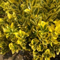 金鑲玉黃楊(原名金冠黃楊),衛(wèi)矛科,衛(wèi)矛屬,北海道黃楊芽變品種,葉片油亮肥厚,葉片芯呈翠綠色,周圍環(huán)包金黃色,遠(yuǎn)遠(yuǎn)望去金黃一片,冬季不落葉,霜雪天亦可保持這種色彩,非常美麗。