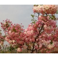 花期3月中旬至4月中旬,花葉同放,雌蕊葉化為一片葉子,花苞紅色,花朵成型后為粉白色,花開一簇簇一團團,花量特別大,花直徑在3-4CM,花瓣5輪以上,花瓣30-38枚,屬大花形,生長勢旺,喜光,適應(yīng)性廣,耐寒,耐旱,病蟲害較少,為最頂級,最具發(fā)展?jié)摿鸦ㄐ缕贩N之一。