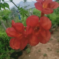 【美國凌霄形態(tài)特征】藤長可達10米或更長;羽狀復葉對生,小葉9枚~11枚;花期夏秋。頂生圓錐花序,花甚密集,花大型,通常為橙紅色有鮮紅色的冠檐,長約7.5厘米,冠筒長約為冠檐長的3倍。